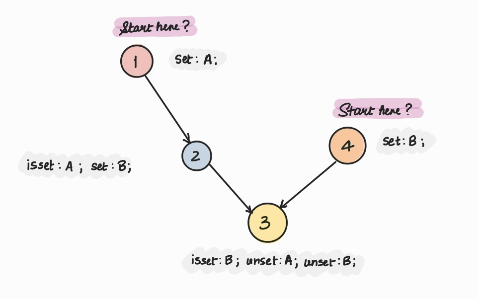 Now, because I know for sure which rules should be enabled to make the ruleset satisfiable at runtime, I can go back to directed graphs for the actual final solution. Some corrections on the last algorithm based on how I was able to reduce the problem to SAT are: